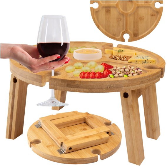Deska do serów Ceuta to nie tylko praktyczny, ale również elegancki dodatek do każdej kuchni czy jadalni. Wykonana została z trwałego drewna bambusowego, ma składane nóżki, co ułatwia przechowywanie i prezentację na stole. Specjalny podział na cztery sekcje oraz centralne miejsce na pojemnik z sosem czynią ją idealnym wyborem do serwowania przekąsek na imprezach i spotkaniach towarzyskich. Dodatkowo, deska posiada wcięcia na cztery kieliszki do wina, co pozwala na eleganckie zestawienie serów i wina, uatrakcyjniając każde spotkanie.