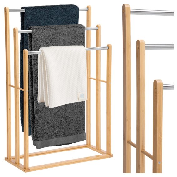 Wieszak na ręczniki Brando to stylowe i funkcjonalne rozwiązanie do łazienki lub pralni. Trzy drążki na różnych wysokościach zapewniają optymalną cyrkulację powietrza i szybkie suszenie ręczników. Wykonany z trwałego, lakierowanego bambusa, jest odporny na wilgoć i łatwy w montażu. Wolnostojąca konstrukcja nie wymaga wiercenia, a kompaktowe wymiary sprawiają, że pasuje nawet do małych pomieszczeń. Elegancja i ekologia w jednym!