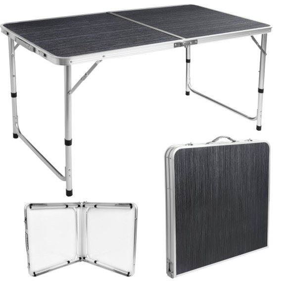 Kup teraz kempingowy stół turystyczny o nowowczesnym designie, z trzypoziomową regulacją wysokości. Stół składa się z aluminiowego stelaża oraz blatu z płyty MDF wysokiej jakości. Zastosowane materiały gwarantują niską wagę 4kg i dodatkowo łatwy transport. Stolik bardzo łatwo się rozkłada i składa do postaci walizki.