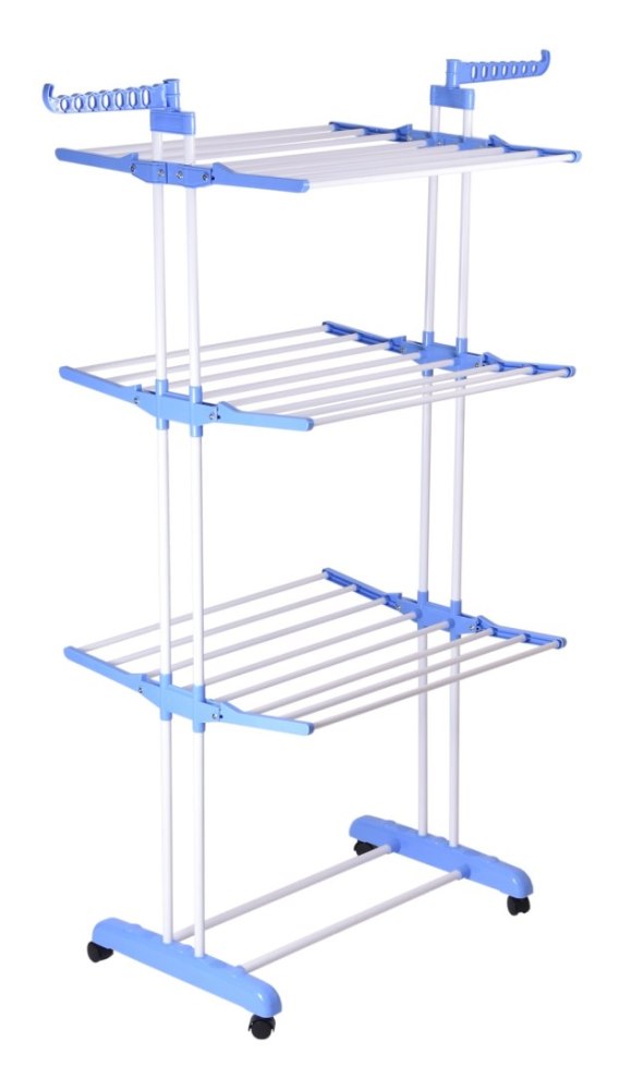 3 poziomy składanych półek + dolna półka + 2 ramiona na wieszaki