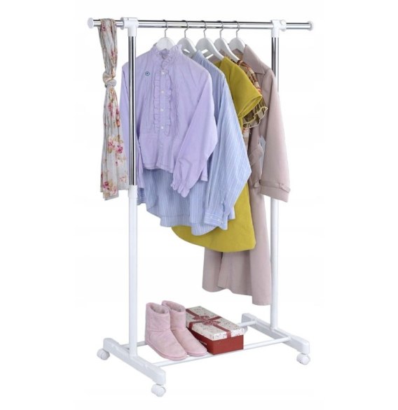 Na tej aukcji oferujemy praktyczny i wytrzymały wieszak garderobiany na kółkach. Wieszak sprawdzi się w każdym domu i w biurze, w którym brakuje miejsca do powieszenia odzieży. Nasz produkt został wyposażony w pojedynczy chromowany drążek z wyjątkowo grubych, chromowanych rurek. Dodatkowym atutem wieszaka jest wytrzymała i zaskakująco pojemna półka na buty, oraz nakładki na końce drążka uniemożliwiające zsunięcie się odzieży. Montaż wieszaka jest niezwykle prosty i nie wymaga użycia narzędzi. Posiada regulację wysokości i szerokości.