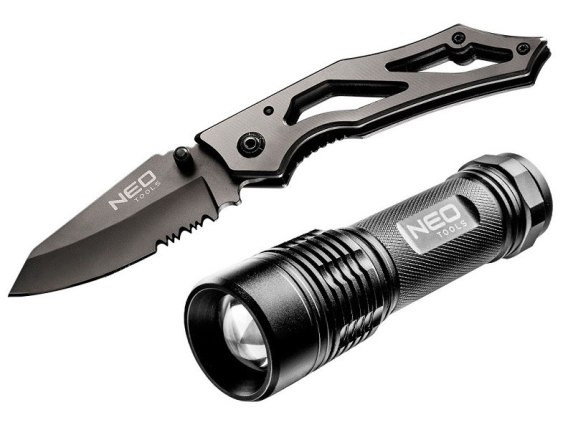Zestaw dwóch użytecznych narzędzi marki Neo. Nóż składany z blokadą posiada ostrze wykonane ze stali 440 o długości 7 cm. Tytanowa obudowa zapewnia długą żywotność narzędzi. Blokada przed nieoczekiwanym zamknięciem zapewnia bezpieczeństwo podczas pracy. Latarka posiada funkcję zoom pozwalającą na zmianę skupienia światła. Klasa IPX7 pozwala na krótkotrwałe zanurzenie latarki. Zasilana trzema bateriami AAA. Latarka do wykorzystania w domu, samochodzie, garażu, piwnicy, na biwaku. Zgodność z europejskimi standardami bezpieczeństwa zapewnia certyfikat CE. Marka NEO spełnia oczekiwania profesjonalistów.