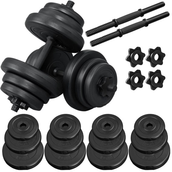 Zawartość zestawu: 2x gryfy, 4x zaciski, 12x obciążenia (4x 2,5 kg, 4x 1,5 kg, 4x 1 kg)