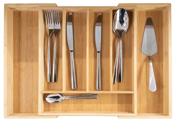 Organizer bambusowy jest rozkładany, boczne przegrody można w razie potrzeby wsunąć do środka i zaoszczędzić cenną przestrzeń. Dzięki niemu w szufladach kuchennych zapanuje ład i porządek. Jego kompaktowe wymiary sprawiają, że będzie pasował do większości standardowych szuflad.