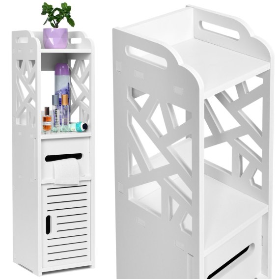 Szafka posiada schowek z drzwiami i półkami wyciętymi w odpowiednim rozmiarze, dzięki czemu można w niej przechowywać dodatkowy papier toaletowy i ręczniki. Dwupoziomowa konstrukcja z półkami zapewnia dodatkową przestrzeń do przechowywania,