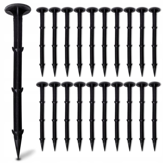 Szpilki ułatwiają montaż oraz zabezpieczają agrotkaninę/agrowłókninę przed działaniem wiatru i zwijaniem się. Wykonane z wytrzymałego tworzywa sztucznego. Szerokość główki to aż 3,5 cm a długość to 20 cm. Każda ze szpilek ma boczne ząbki bardzo mocno wczepiające się w podłoże.