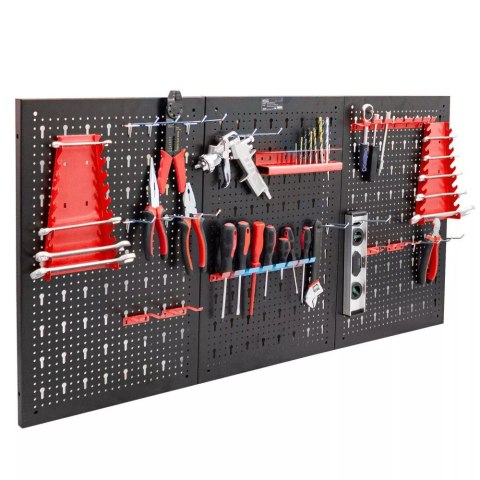 Trzy solidne panele perforowane, 25 uchwytów na narzędzia i stalowa konstrukcja, która pozwala na uporządkowanie przestrzeni roboczej.