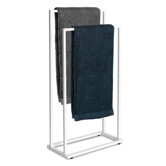 Gesi to wolnostojący praktyczny wieszak na ręczniki. Wykonany z najwyższej jakości stali malowanej proszkowo i wykończony na matowy biały kolor. Ma aż 2 ramiona na różnych wysokościach, co ułatwia zakładanie i ściąganie ręczników. Ramowa konstrukcja w kształcie litery U zapewnia szybsze i dokładniejsze suszenie ręczników oraz oszczędność miejsca. Stojak jest stabilny, a zarazem lekki. Bez problemu przeniesiemy go w wybrane miejsce. Podstawa stojaka zabezpieczona jest ochronnymi stopkami, które zapobiegają rysowaniu się podłogi. Jest doskonałym uzupełnieniem każdej łazienki. Oprócz walorów praktycznych stanowi ciekawą ozdobę pomieszczenia, wobec której nie można przejść obojętnie. Idealnie wkomponuje się we wnętrza w stylu boho, skandynawskim, nowoczesnym.