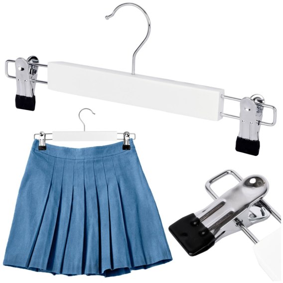 Do tego celu zaprojektowano wieszak drewniany z dwoma klipsami. Wykonany z litego drewna, trwały i mocny-pozwoli zaoszczędzić sporo przestrzeni w szafie i uporządkować Twoją garderobę. Został dodatkowo polakierowany, dzięki czemu zyskał dodatkowe zabezpieczenie od wilgoci oraz gładką powierzchnię. Jest w pełni bezpieczny nawet dla delikatnych ubrań. Rozstaw klipsów można dowolnie zmieniać. Organizer z klipsami sprawdzi się świetnie zarówno w przypadków spódnic jak i spodni.