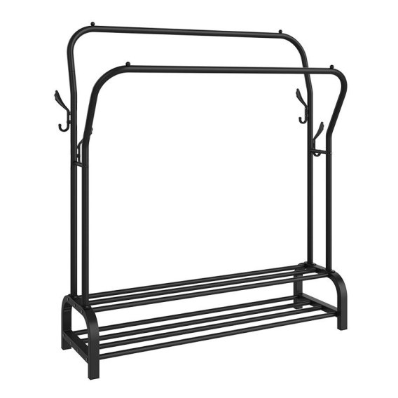Wieszak garderobiany Lary to idealne rozwiązanie dla osób, które potrzebują dużo miejsca na przechowywanie swoich ubrań i akcesoriów. Ten podwójny wieszak garderobiany wyposażony jest w dodatkowe haczyki na akcesoria oraz dolne półki, które pozwalają na przechowywanie butów i innych przedmiotów. Konstrukcja wieszaka wykonana jest z solidnych stalowych rurek, które zostały malowane proszkowo na matowy czarny kolor, zapewniając mu stabilność i wytrzymałość. Dodatkowo, dwie poziome główne rurki posiadają blokady przed zsuwaniem się ubrań, co zapobiega nieporządkowi i zapewnia ładny wygląd garderoby. Wieszak Firma to model wielofunkcyjny i praktyczny, wykonany z materiałów najwyższej jakości, dbając o każdy szczegół. Dzięki niemu można pomieścić wiele ubrań i akcesoriów, jednocześnie oszczędzając cenną przestrzeń w garderobie.