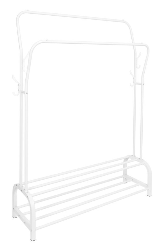 Wieszak garderobiany Lary to idealne rozwiązanie dla osób, które potrzebują dużo miejsca na przechowywanie swoich ubrań i akcesoriów. Ten podwójny wieszak garderobiany wyposażony jest w dodatkowe haczyki na akcesoria oraz dolne półki, które pozwalają na przechowywanie butów i innych przedmiotów. Konstrukcja wieszaka wykonana jest z solidnych stalowych rurek, które zostały malowane proszkowo na biały kolor, zapewniając mu stabilność i wytrzymałość. Dodatkowo, dwie poziome główne rurki posiadają blokady przed zsuwaniem się ubrań, co zapobiega nieporządkowi i zapewnia ładny wygląd garderoby. Wieszak Lary to model wielofunkcyjny i praktyczny, wykonany z materiałów najwyższej jakości, dbając o każdy szczegół. Dzięki niemu można pomieścić wiele ubrań i akcesoriów, jednocześnie oszczędzając cenną przestrzeń w garderobie.