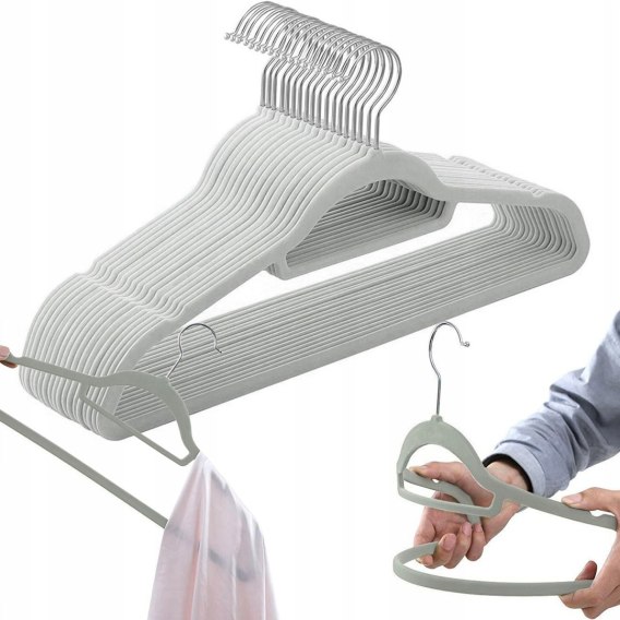 Wieszaki metalowe pokryte miłym w dotyku welurem. Powierzchnia antypoślizgowa zapobiega zsuwaniu się ubrań. Metalowe wnętrze gwarantuje duży udźwig wieszaków- do pięciu kilogramów każdy. Wieszak posiada dwie poprzeczki, mniejsza na dodatki, większa na spodnie. Ramiona z dodatkowymi wcięciami na topy i sukienki o drobnych ramiączkach. Obrotowy hak pozwala zawiesić je wygodnie niemal wszędzie.
