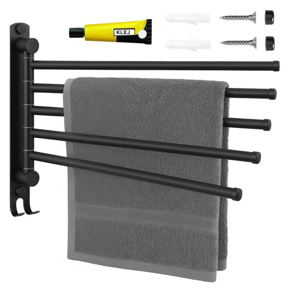 Wieszak na ręczniki z pięcioma obrotowymi ramionami oraz dodatkowym haczykiem zapewni porządek w Twojej łazience oraz przyśpieszy schnięcie ręczników. Ramiona można niezależnie ustawiać lub złożyć na dowolną stronę ściany. Wieszak został wykonany ze stali nierdzewnej , dzięki temu jest on estetyczny i wytrzymały.