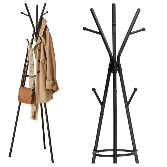 Nowoczesny wieszak stojący Eris to praktyczne rozwiązanie do przechowywania odzieży wierzchniej, które nie tylko pomaga utrzymać porządek, ale i wprowadza elegancję do każdego wnętrza. Dzięki swojej smukłej konstrukcji i matowemu, czarnemu wykończeniu doskonale wpasuje się w przedpokój, biuro czy poczekalnię, nie zajmując przy tym dużo miejsca. Stabilna stalowa konstrukcja, aż 6 haczyków i dodatkowy uchwyt na parasole sprawiają, że to mebel, który nie tylko dobrze wygląda, ale też realnie ułatwia codzienne życie.