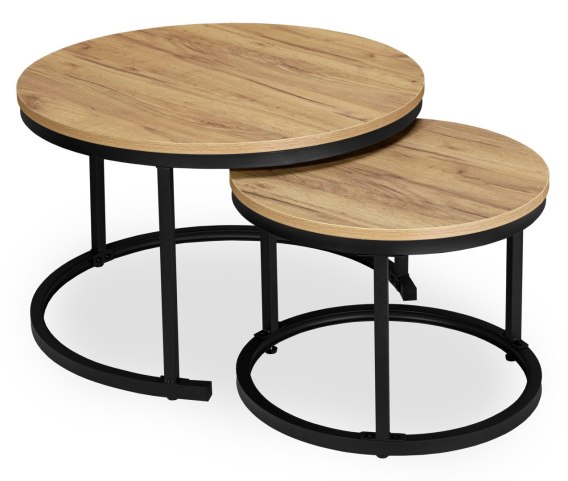 Stoliki loftowe Galen to komplet dwóch sztuk o różnych wysokościach, dzięki czemu tworzą piękną kompozycję i są bardzo praktyczne. Niższy stolik można schować pod wyższym w razie potrzeby. Galen to zestaw najwyższej jakości, wykonany z największą starannością. Stoliki tworzy stabilna rama ze stali malowanej proszkowo oraz mocny blat w kolorze dębu Craft. Polecamy do do stylu loft, glamour i vintage.